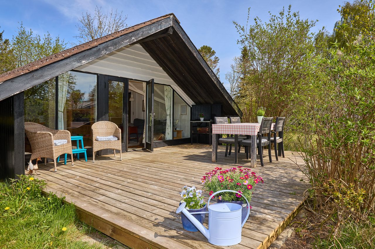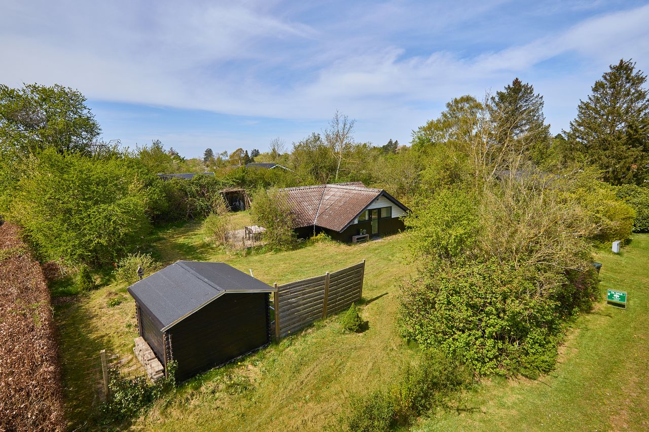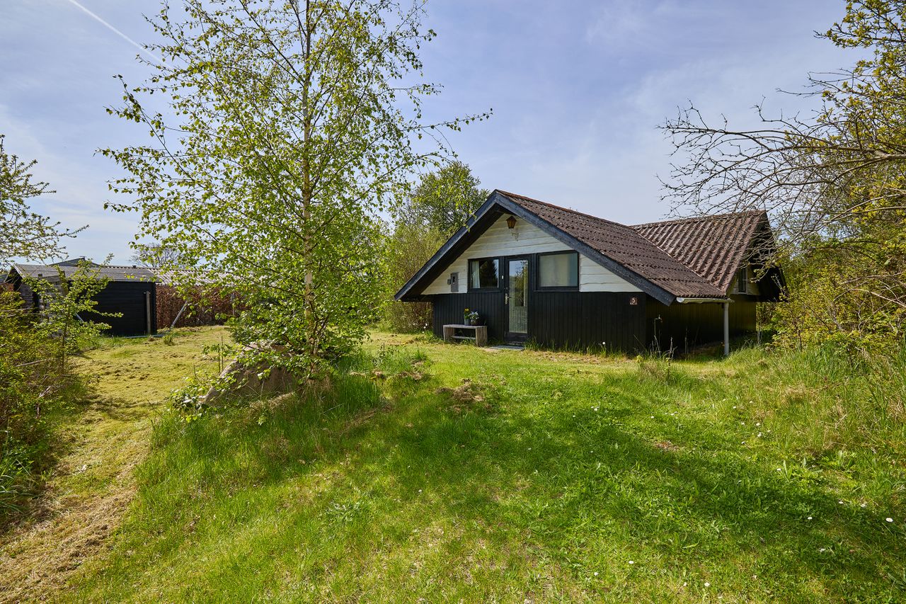 Dette søde fritidshus, med lofter til kip, byder på: Entre, 2 gode værelser, nyt flisebadeværelse med bruseniche og ny El-vandvarmer, hvidt Ikea-køkken med vaskemaskine og opvaskemaskine, , lys stue med udgang til den store solrige træterrasse ( i stuen kan installeres brændeovn).