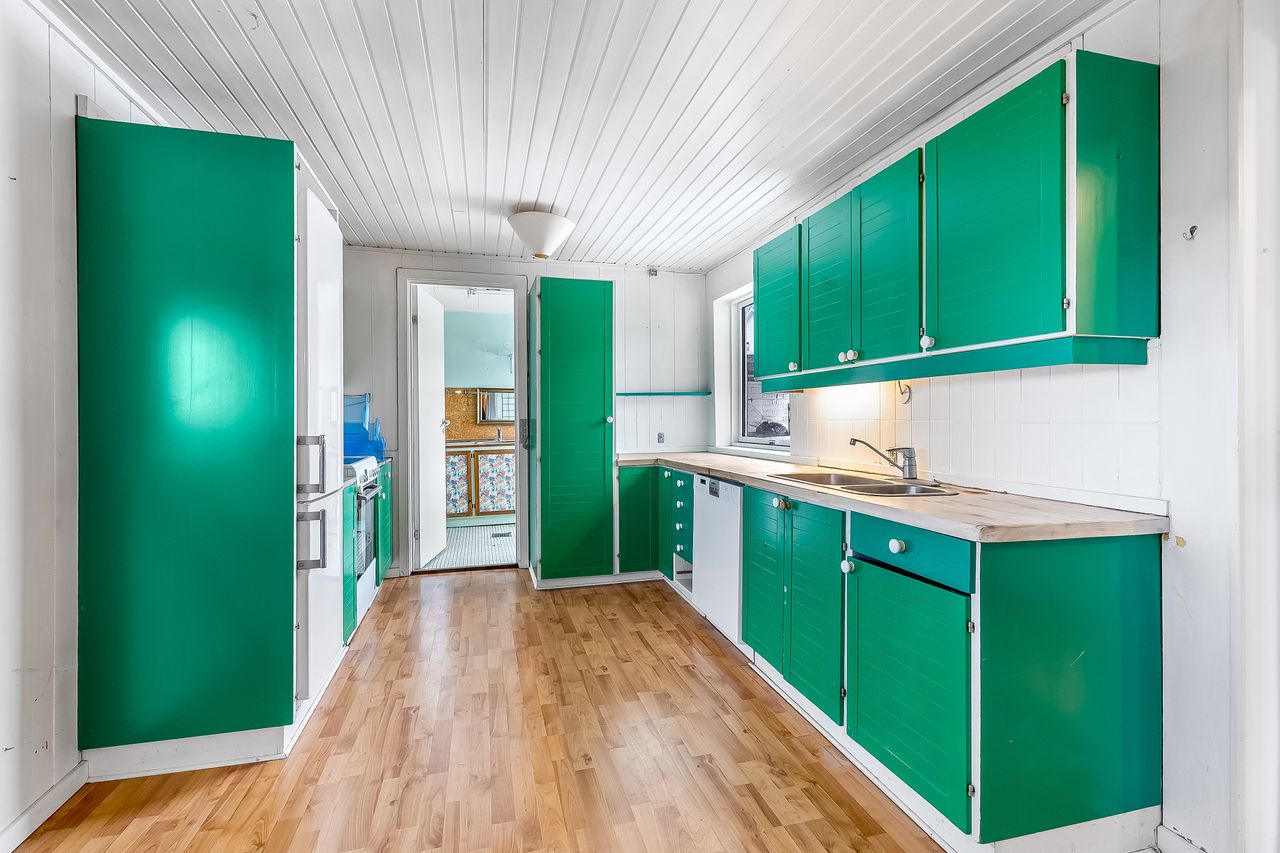 Charmerende ældre spisekøkken med udgang til godt spisekammer/viktualierum. Godt rummeligt ældre bryggers. Ældre charmerende gæstetoilet.