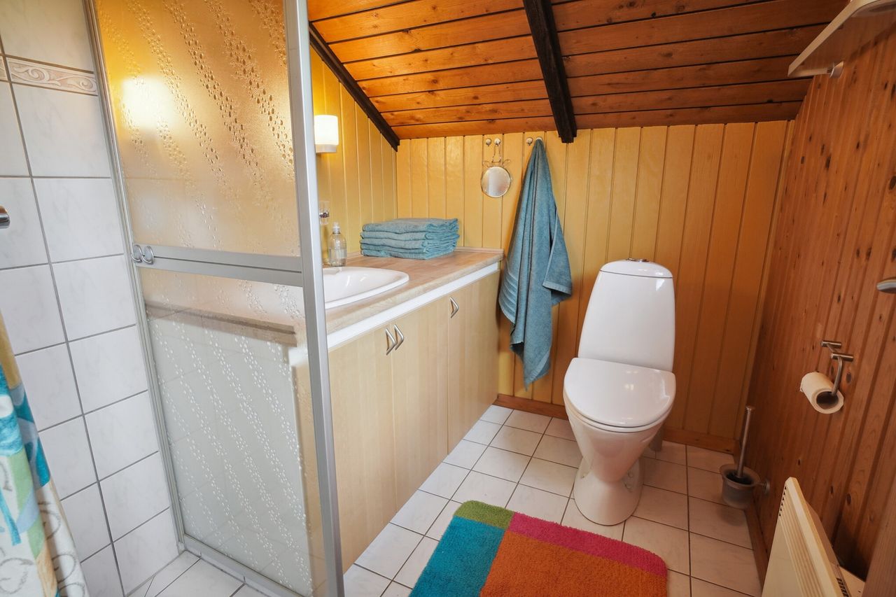 Soveværelse med 2 senge. Pænt flisebadeværelse med hvide fliser på gulvet med el gulvvarme samt