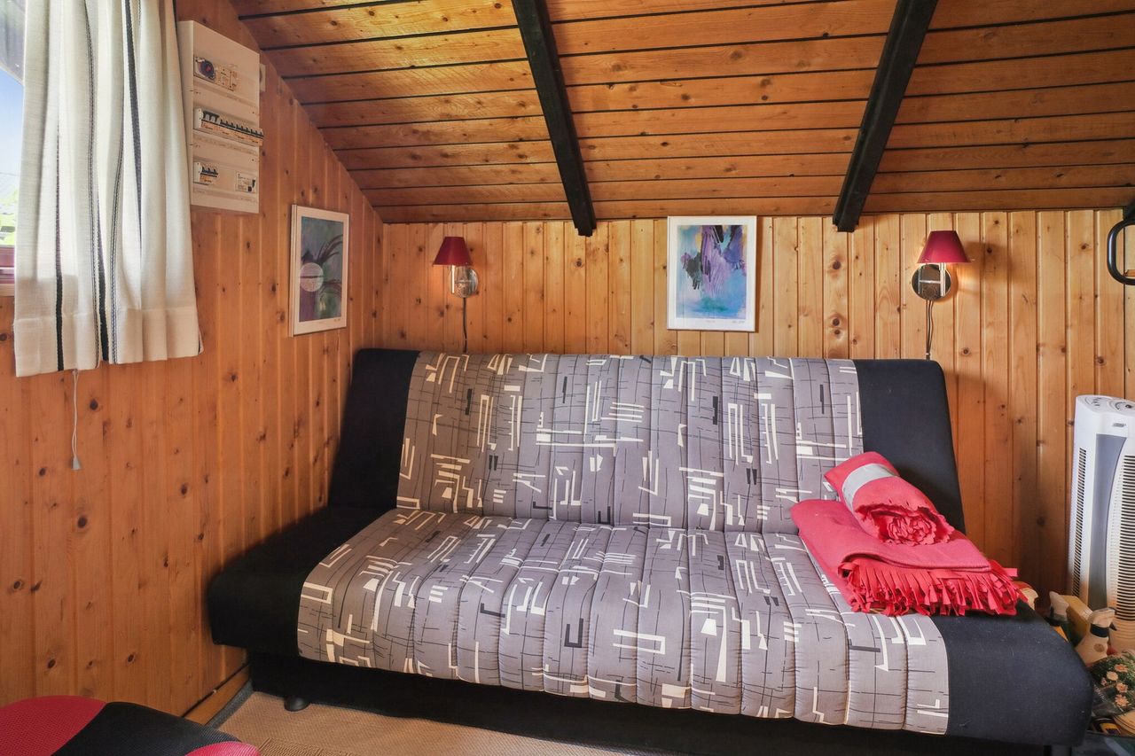 Dette søde fritidshus byder på: Entre med tæpper, Værelse med 2 skabe og plankegulve i fyrretræ,
