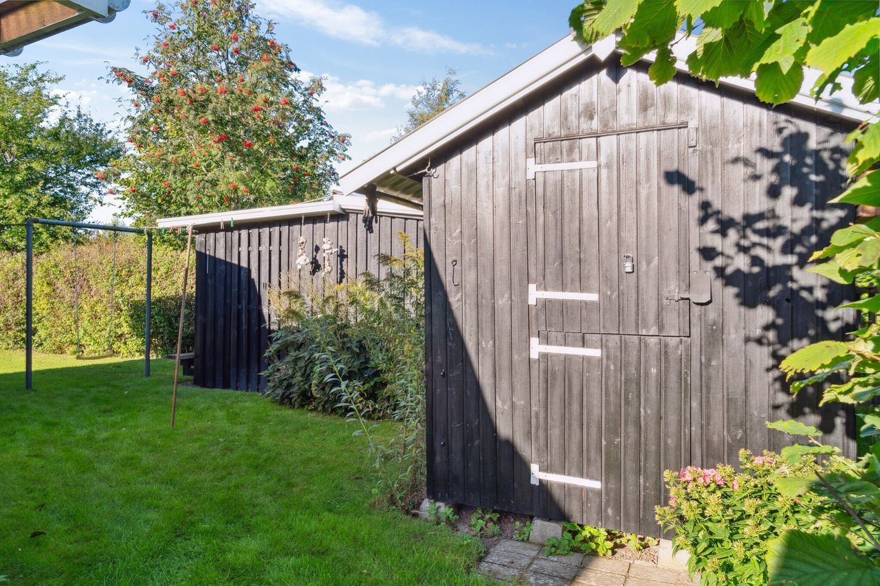 Udhus med termotag. Anneks med værksted.