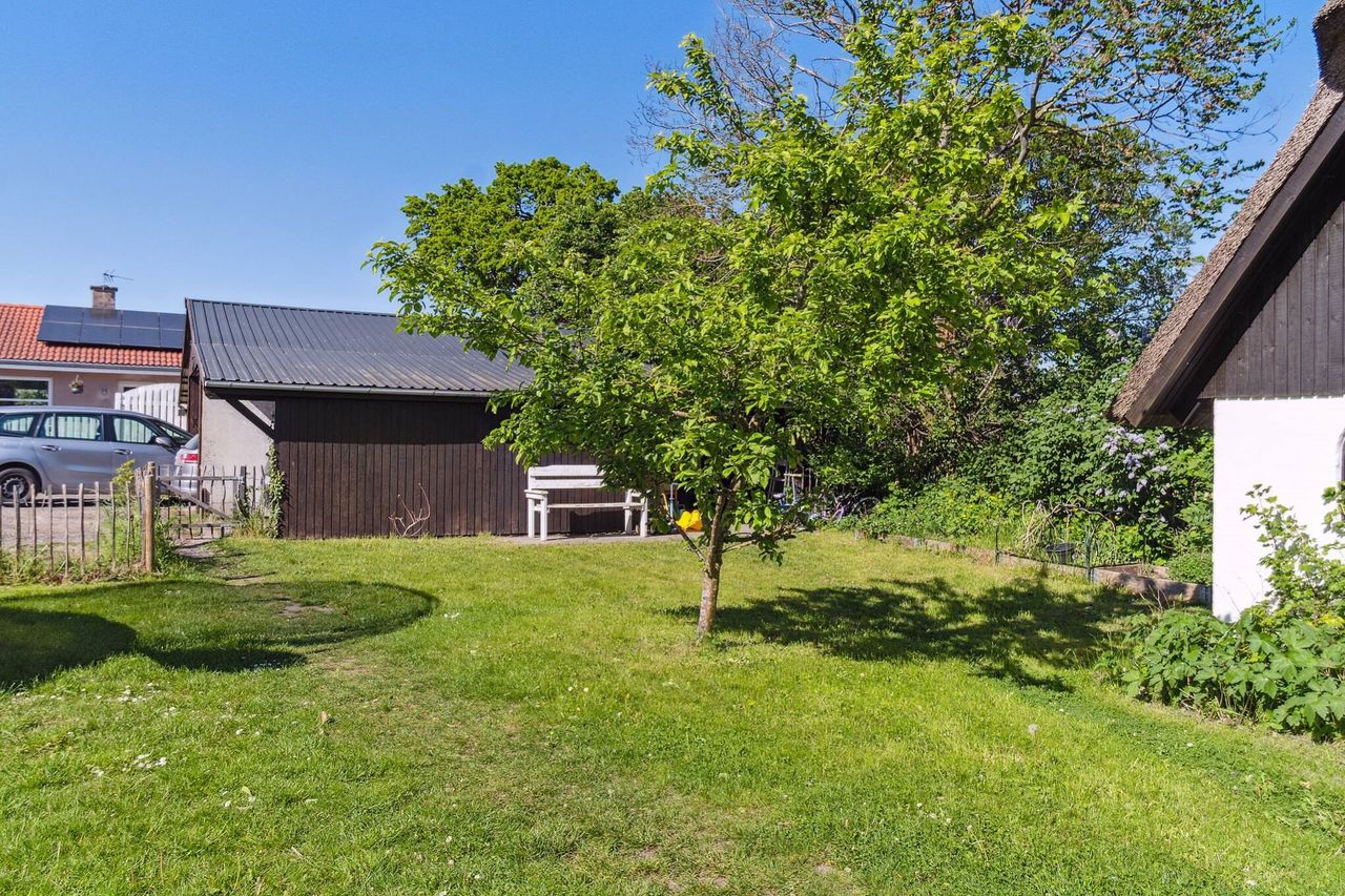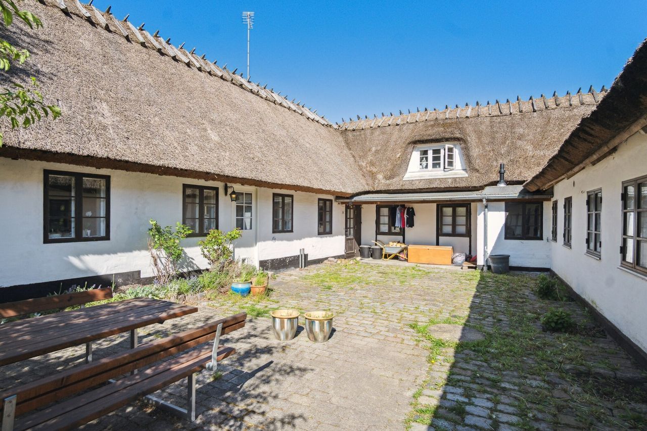 Huset står med pudsede vægge og et godt stråtag.
