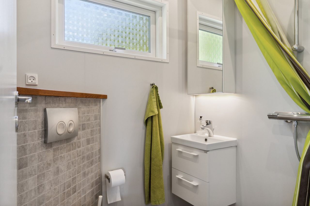 Huset byder på: Entre, flot nyere lyst badeværelse med gulvvarme, væghængt toilet, unidrain og spots i