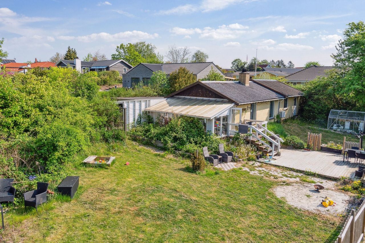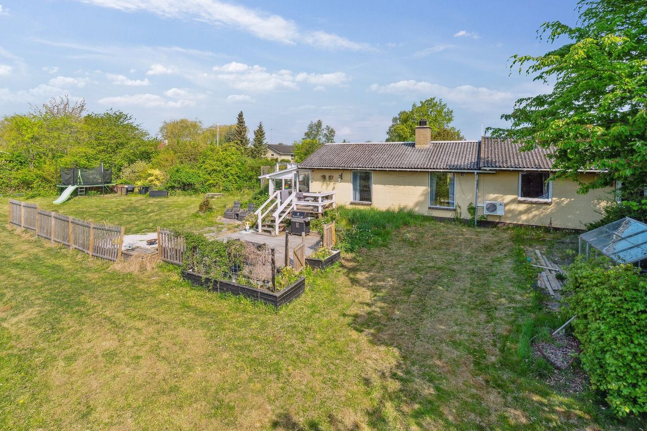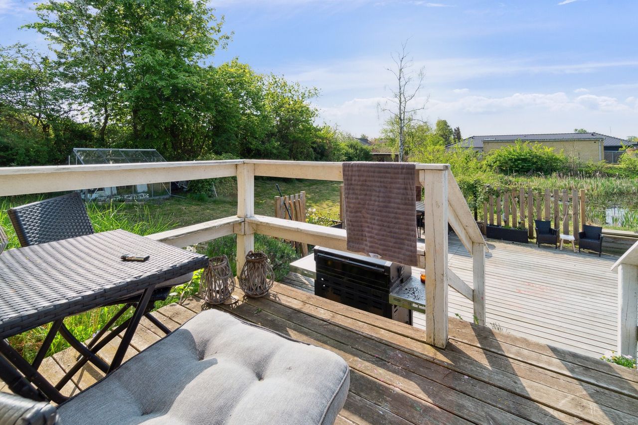 Dejlig have rundt om huset og søen. Der medfølger carport med udhus og flere skønne solrige terrasser.