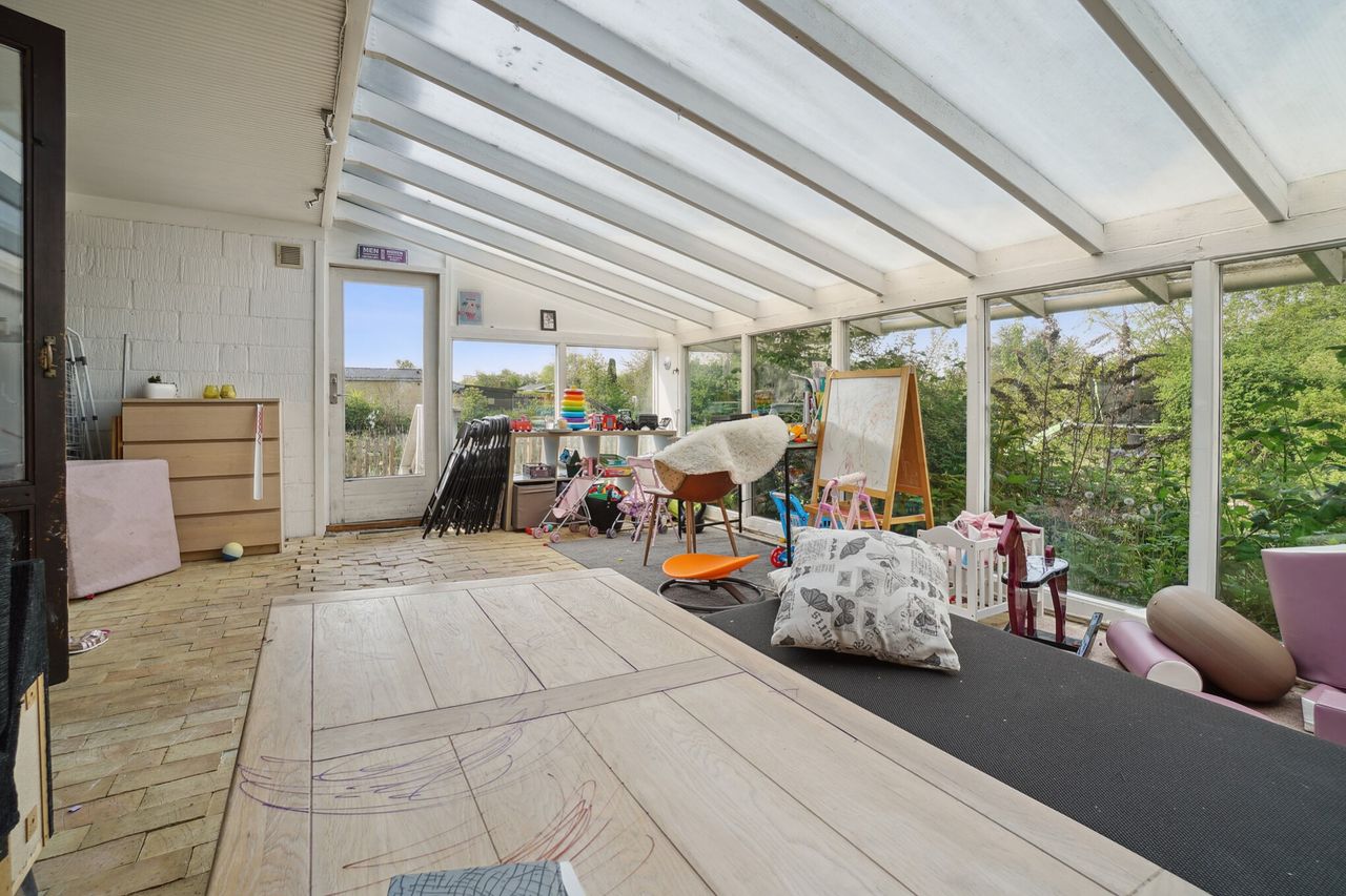 opvaskemaskine. Rummelig og lys stue med brændeovn samt udgang til havestue/udestue, der er