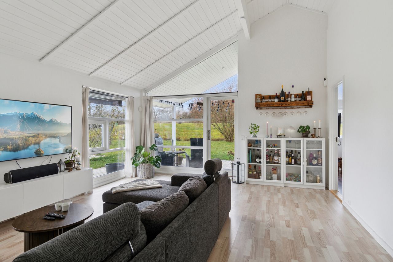 Der er dejligt loft til kip i alle opholdsrum og gulvvarme overalt via det nyere gasfyr.