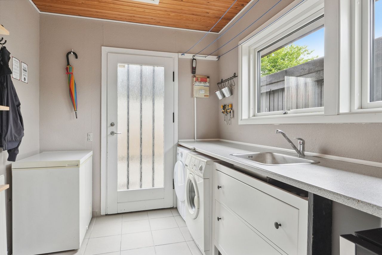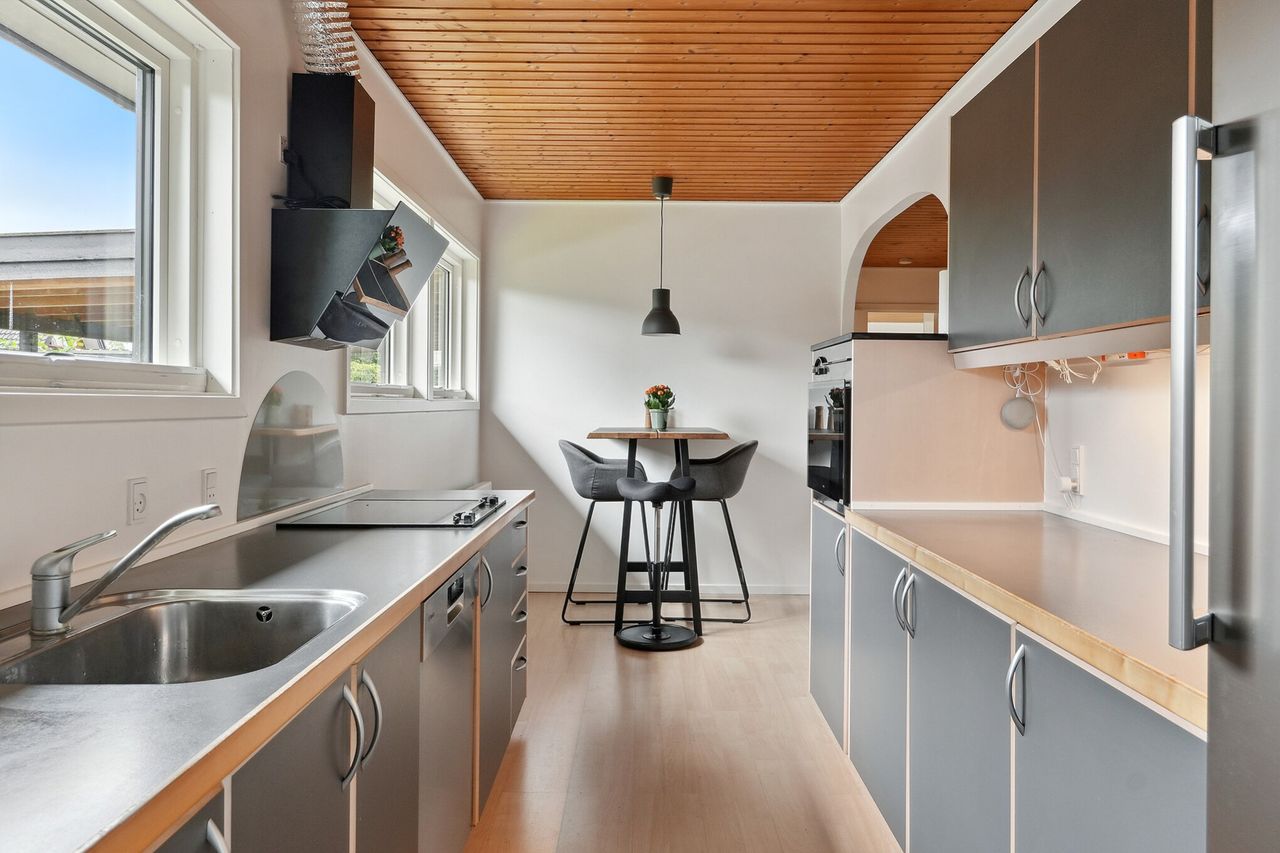 Fint spisekøkken med mange skabe, et funktionelt bryggers.