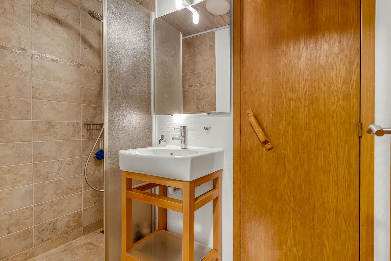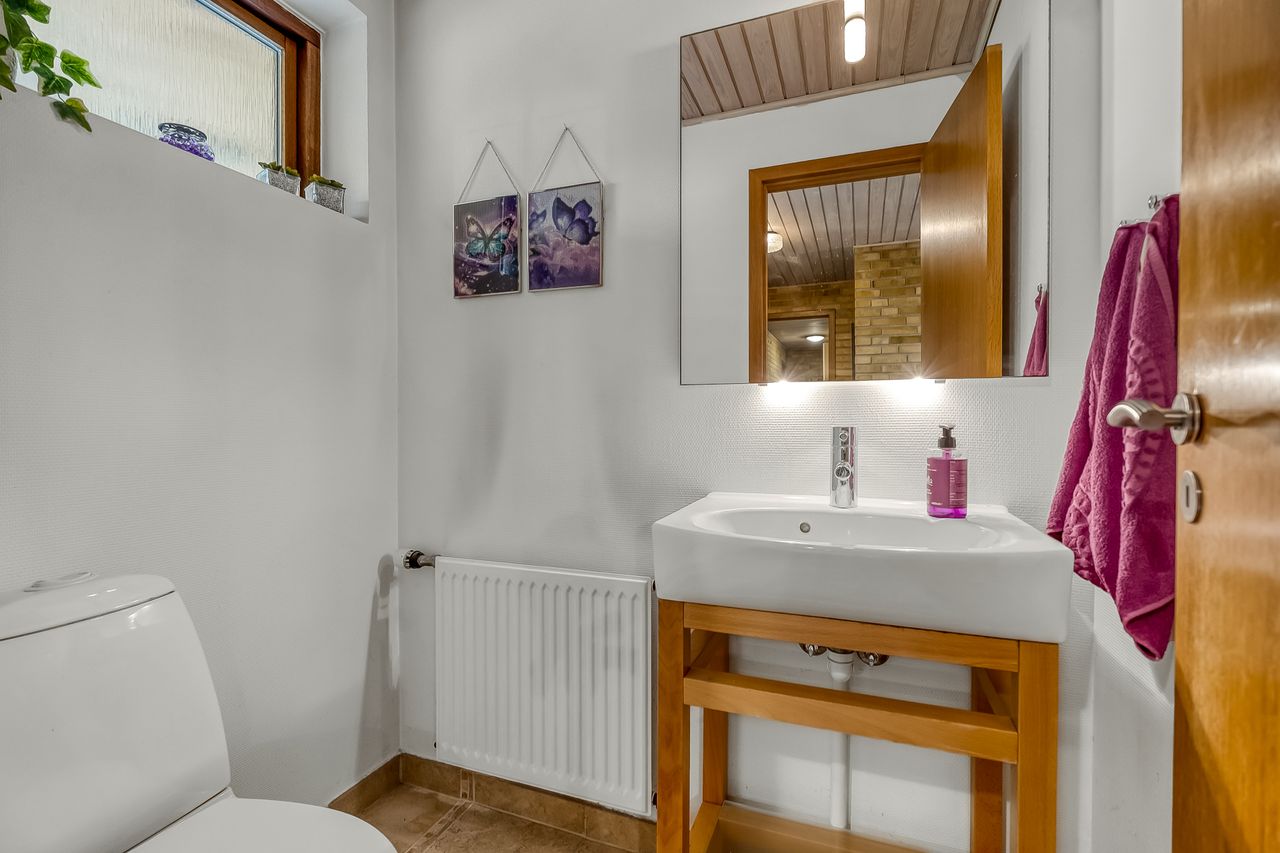 Huset indeholder: Rummelig entre med klinker, Pænt gæstetoilet, Børneværelse med støbt gulv. Fint badeværelse med brus og sauna. 2 gode børneværelser.