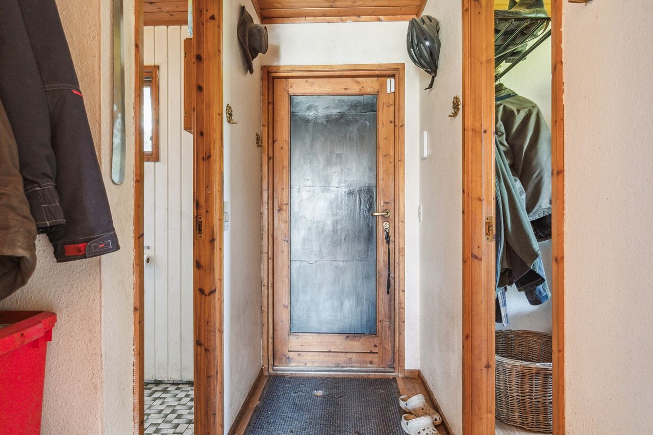 Dette fine hus på gode 73 kvm byder på: Entre med plankegulve/klickgulve. Oprindeligt badeværelse med