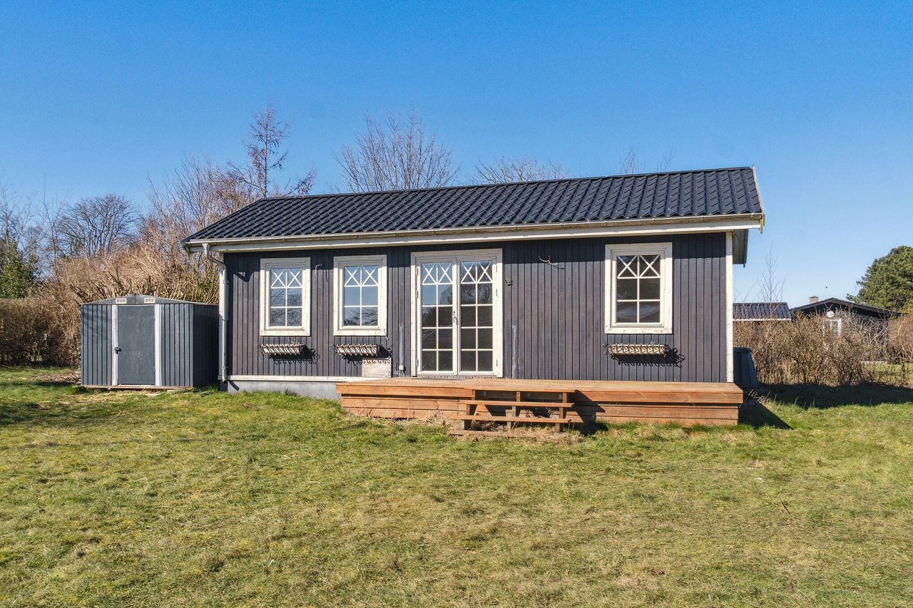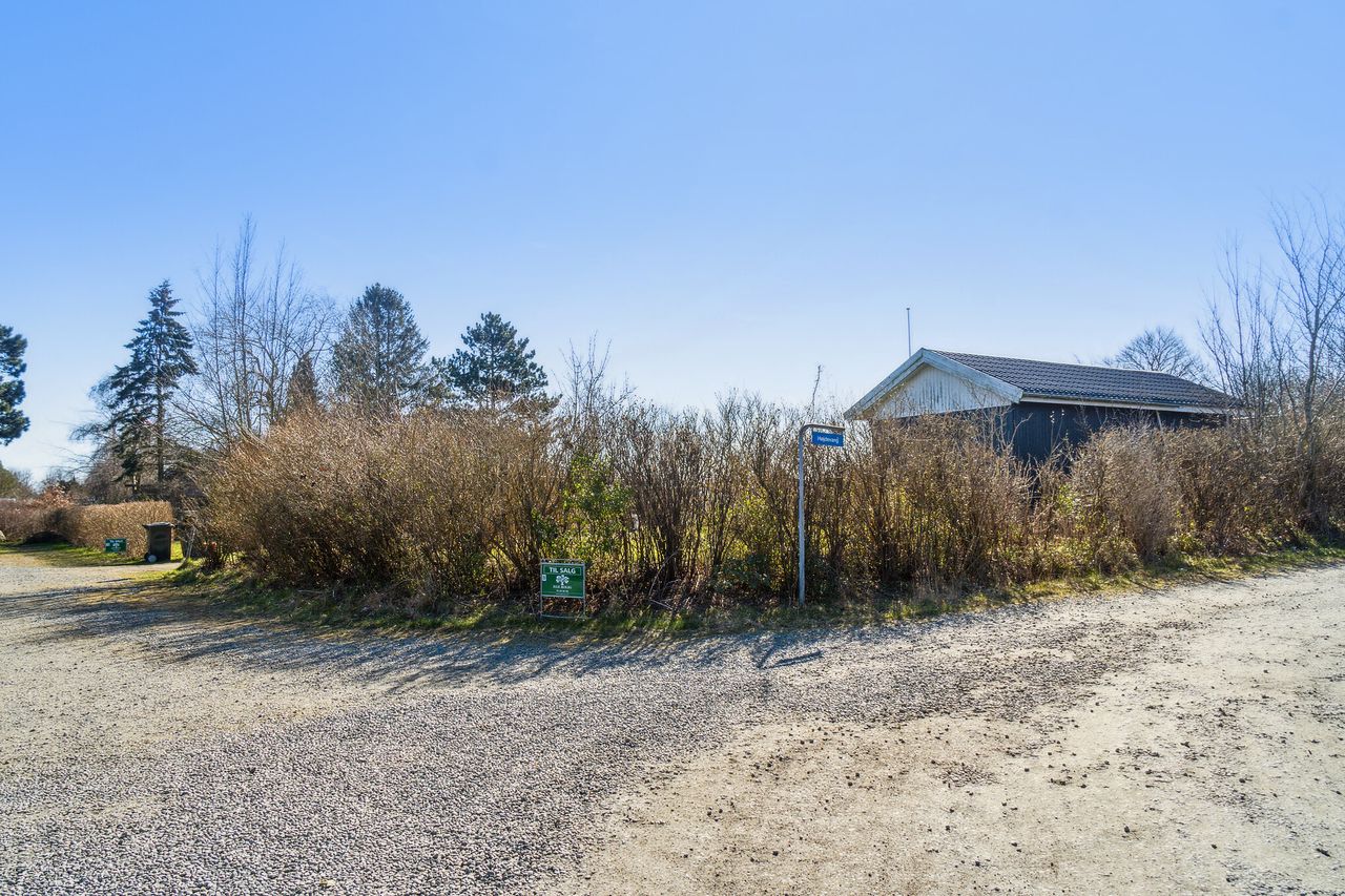 Skøn beliggende solrig fritidsgrund med fint udhus på, hvor der nemt kan tilbygges.