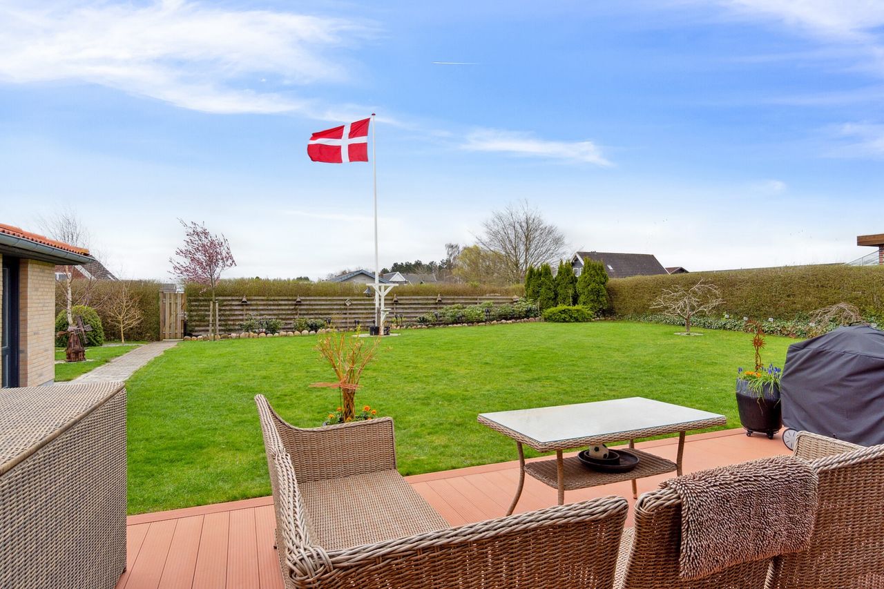 En skøn have med flagstang og gode hyggekroge.