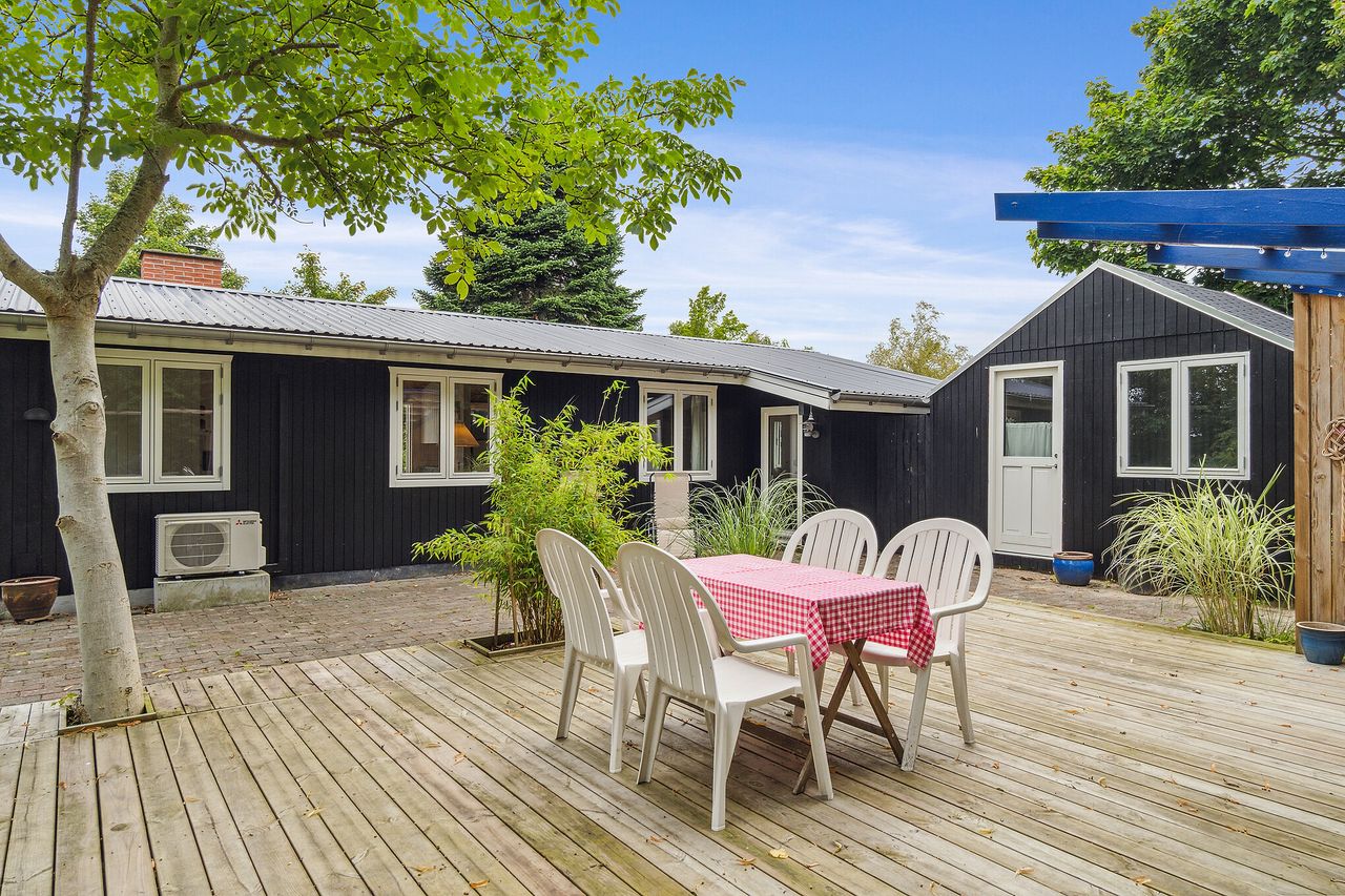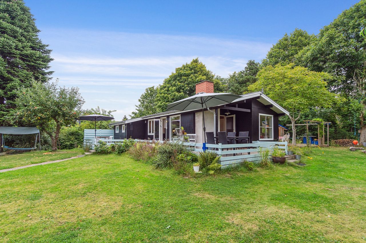 Huset er flot nymalet. Flere skønne store solrige træterrasser. / bålplads hyggekroge m.m.
