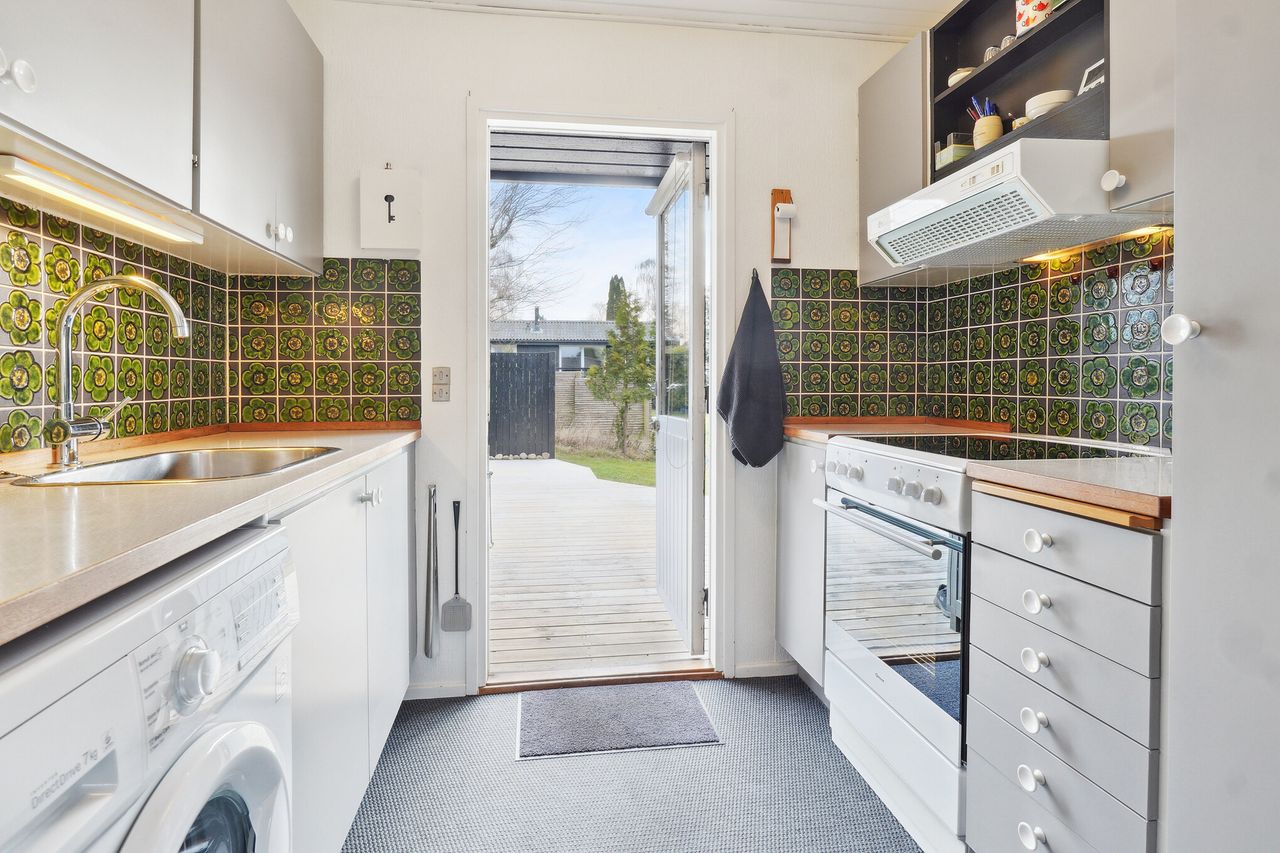 Huset byder på: Hyggeligt oprindeligt køkken i skøn retrostil - der er vaskemaskine i køkkenet. Hyggelig og lys stue med udsigt til haven og udgang til rummelig havestue/udestue med glasskydedøre. Godt værelse med 2 senge. Fint soveværelse med dobbeltseng og 1 skab.