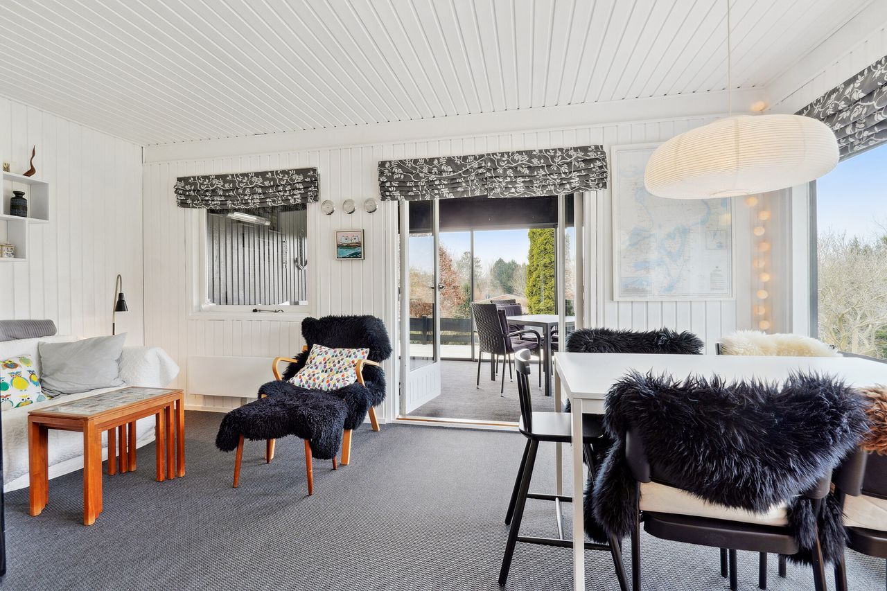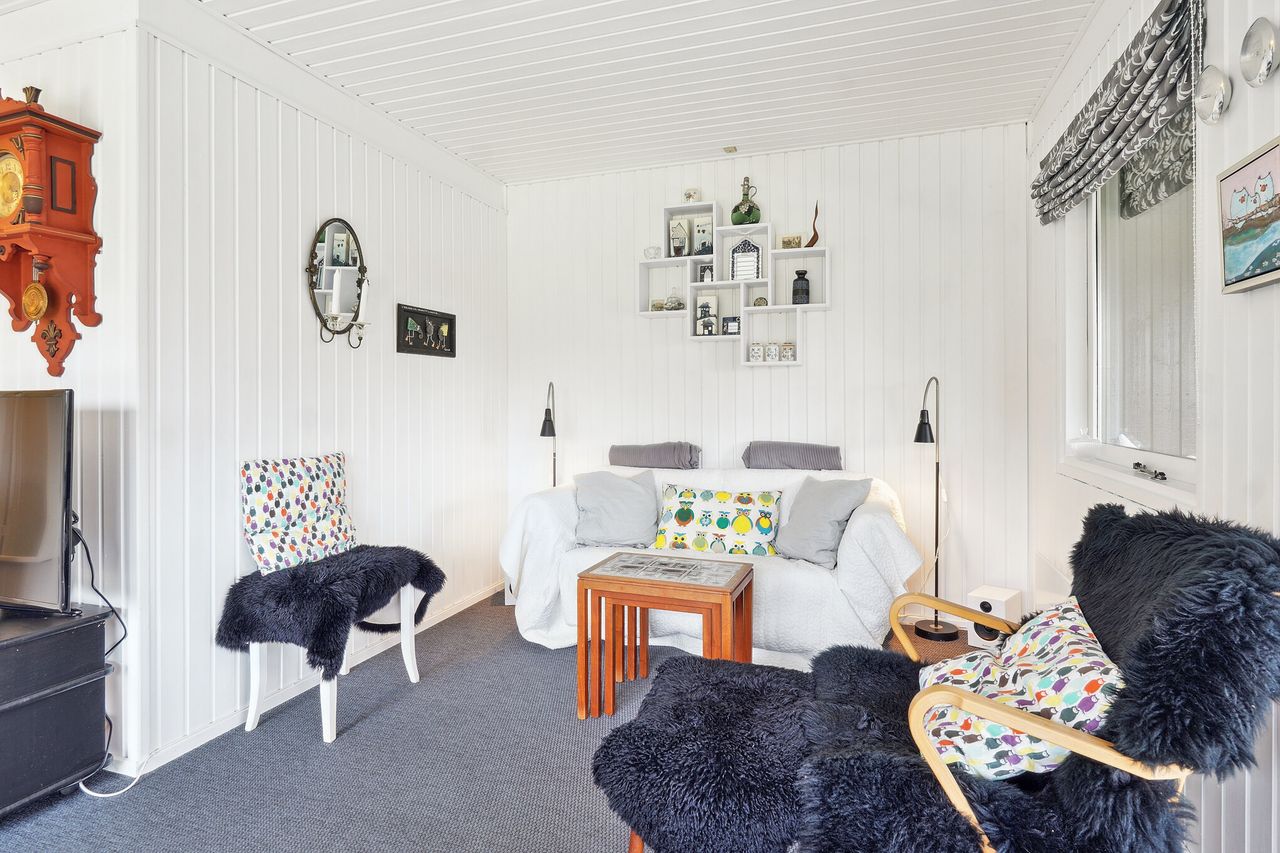Sommerhuset fremtræder meget lyst og indbydende, hvidmalet indvendigt.