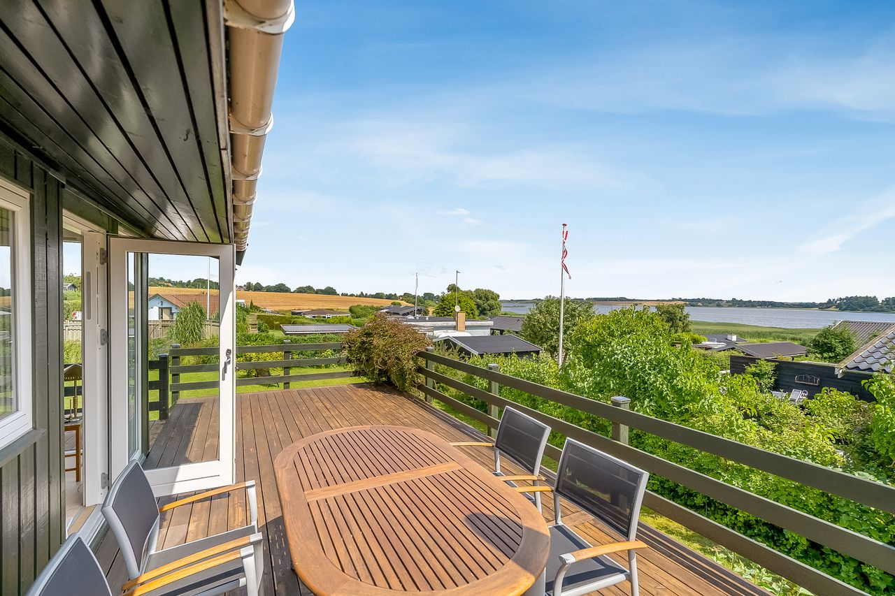 Ved huset er anlagt alle tiders flotte store træterrasse, hvor de skønne sommeraftener kan nydes med kaffen og kigget udover fjorden.