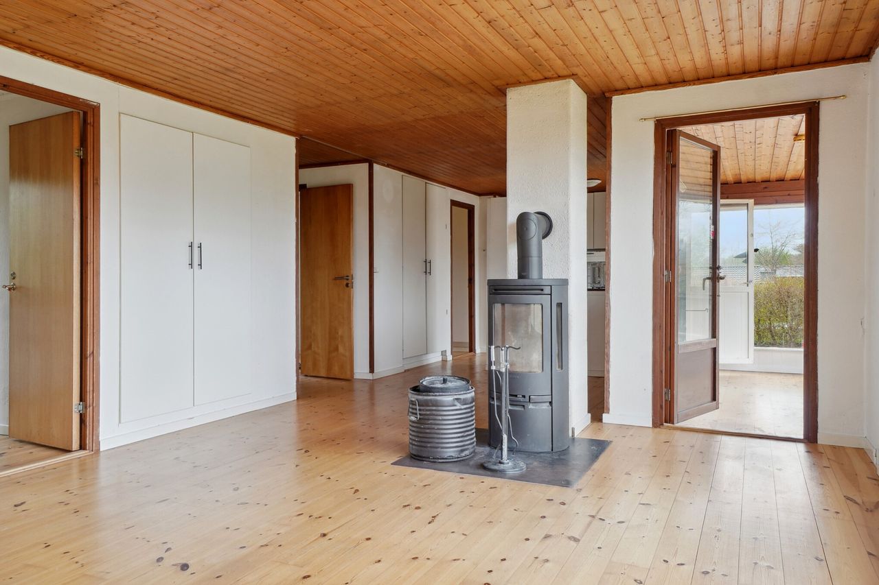 plankegulve, fint kig til haven, brændeovn samt varmepumpe.