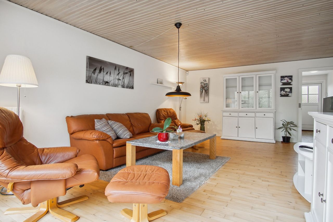 lys stue med udgang til haven, pænt badeværelse md gulvvarme og bruseniche.