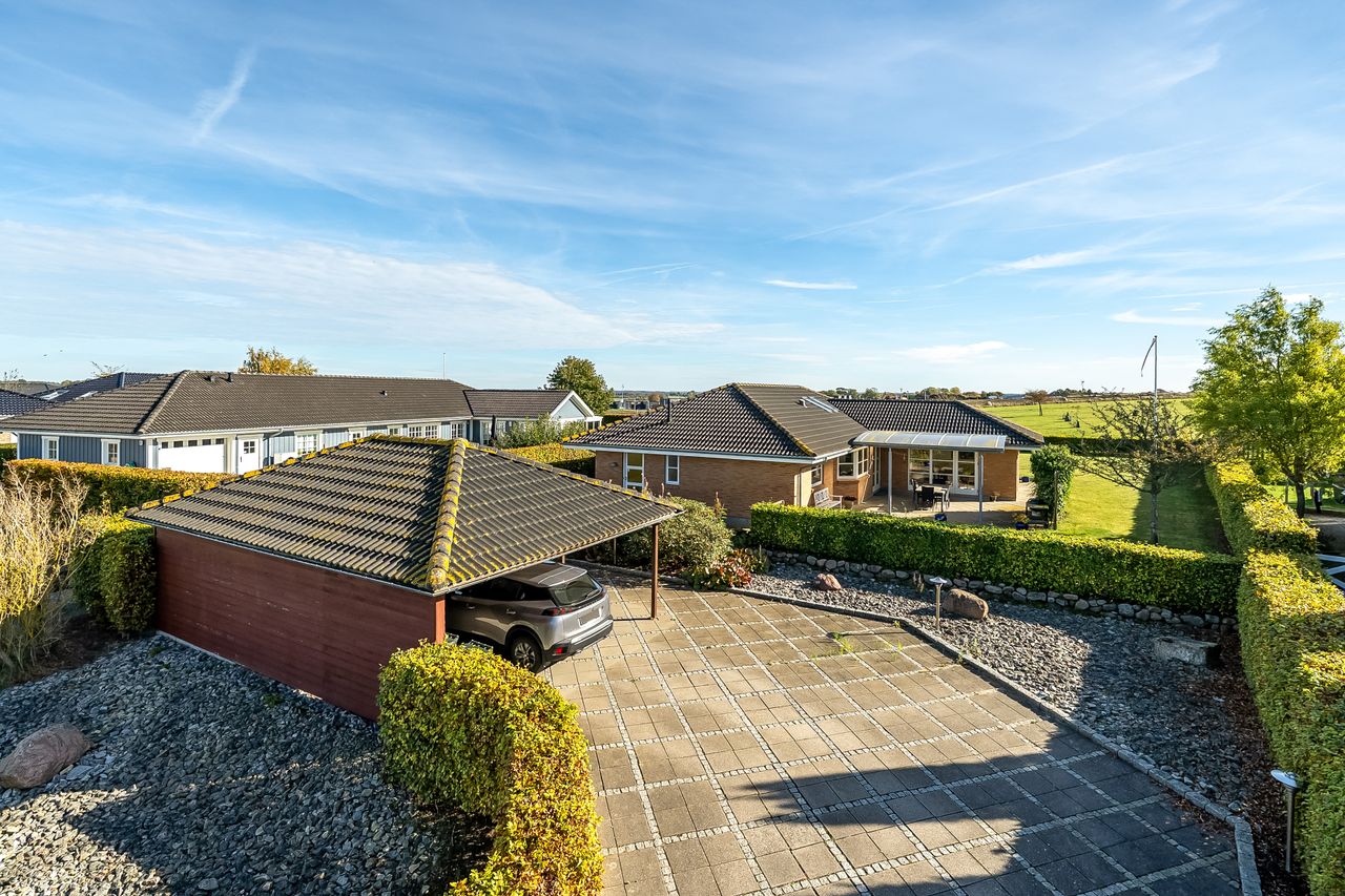 Der medfølger ligeledes flot anlagt have/terrasse, skøn carport med spots, stort udhus /værksted med støbt gulv og strøm indlagt.