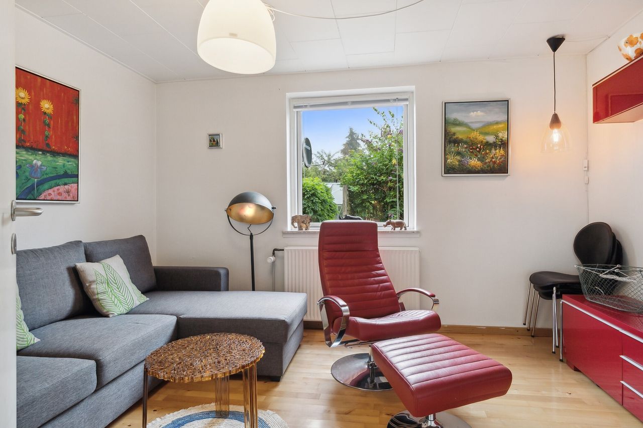 4 gode værelser, entre, badeværelse med bruseniche, lys stue med udgang til den sydvendte