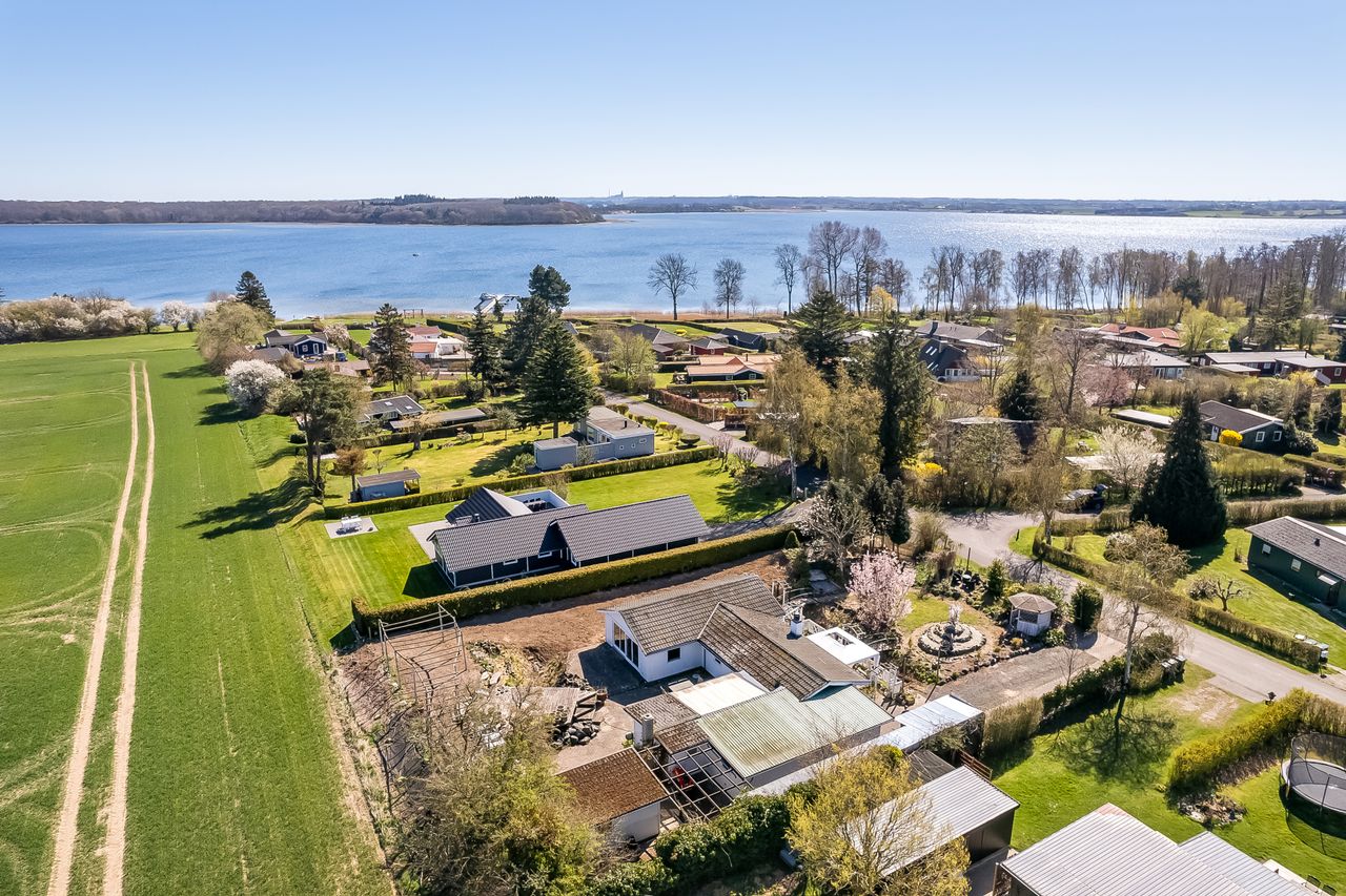 Huset byder ligeledes på gode store rum, med stort NYT flot kvalitets køkken fra Vordingborg køkkener, kun 2 år gammelt, med stor spiseplads og brændeovn, tilligemed udgang til haven. Stor lys rummelig stue, med meget flot udsigt til mark og Fjord & med skøn udgang til haven.