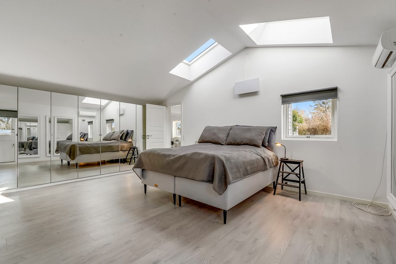Fantastisk stort ca 28-30 m2 soveværelse med loft til kip med 2 ovenlys, stor skabsvæg og udgang til terrassen.
