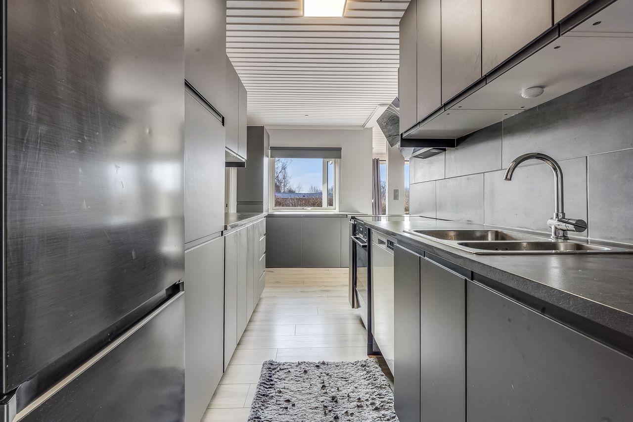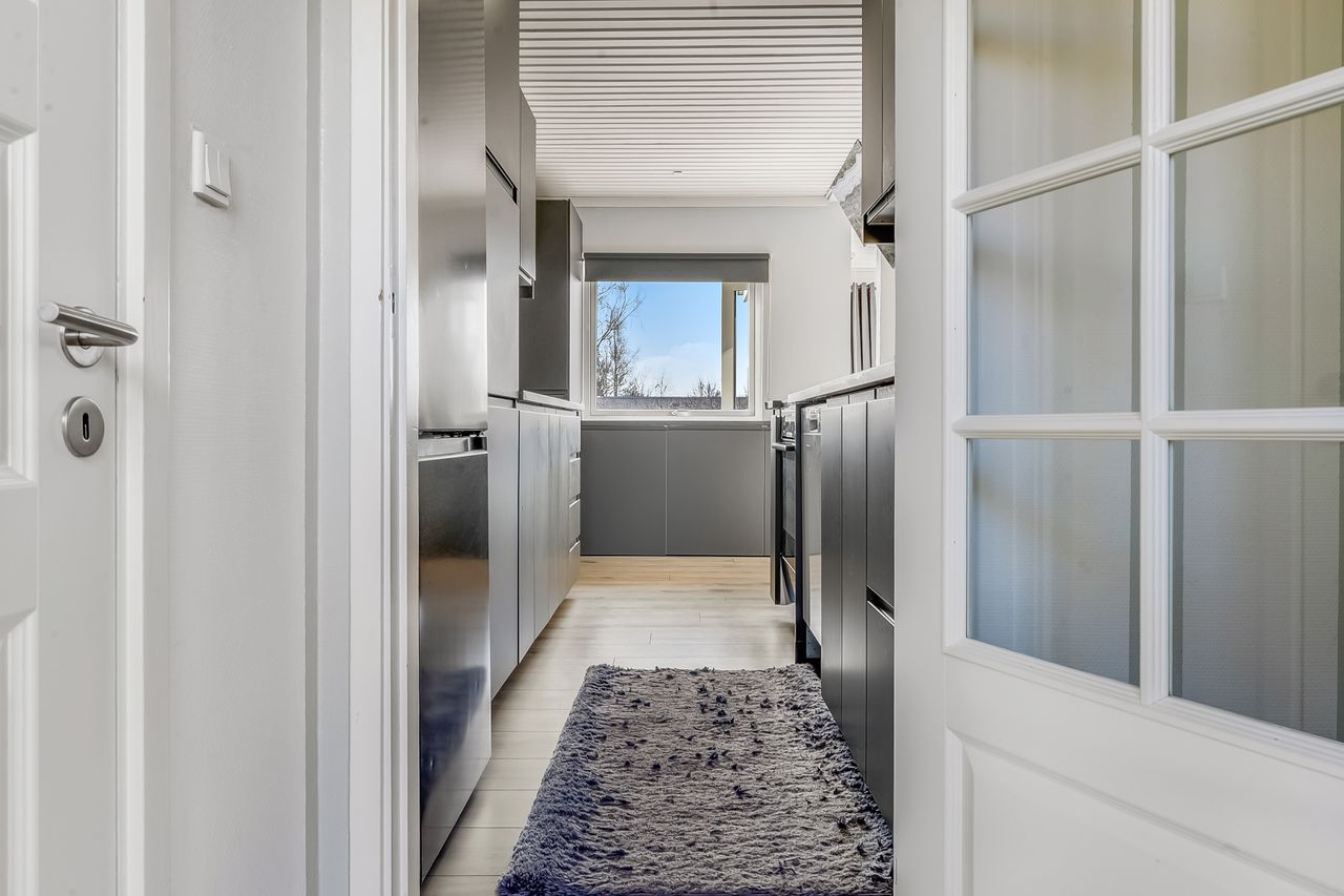 Flot nyt køkken fra Ikea med mange skabe/skuffer. - Dejlig lys stue med tæpper på gulvet, Ny varmepumpe og skøn lys spiseplads samt udgang til den store skønne solrige nye træterrasse.